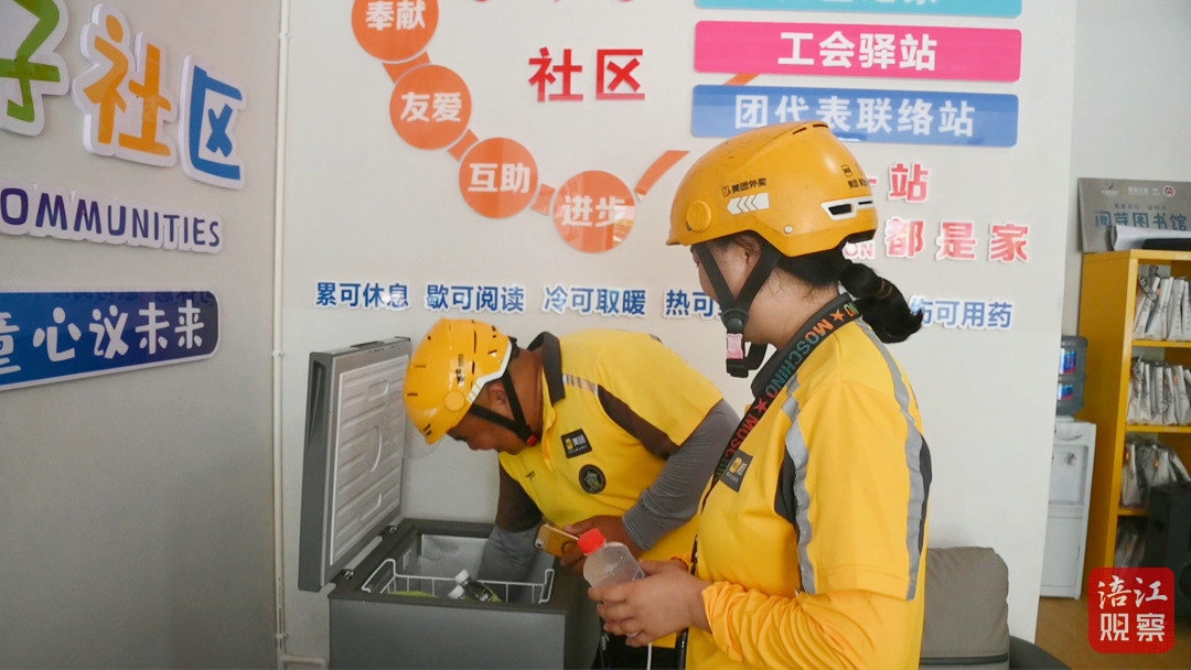 除了快速方便地补充“能量”,驿站内共享充电宝、微波炉、急救药箱等设施一应俱全,书架上还摆放着《劳动权益保障手册》等实用资料。宋华祥告诉记者,“大家累了的时候,第一时间想到这里,里面啥子设施都有,给我们家的感觉。我们确实感受到了政府、工会对我们的关心,像这段时间的‘送清凉’活动,还有平常的政策法律咨询等,我们都切身感受到了。”