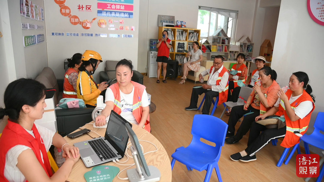 走进永昌镇尔玛社区工会驿站,空调全力运转,温度宜人。外卖员陈红梅与环卫工人们坐在椅子上,一边喝着免费提供的冰镇矿泉水,一边纳凉休息。陈红梅坦言,“这里开的空调,还有凉水,感觉很舒服。在这儿休息安逸,还给我们免费检查身体。”